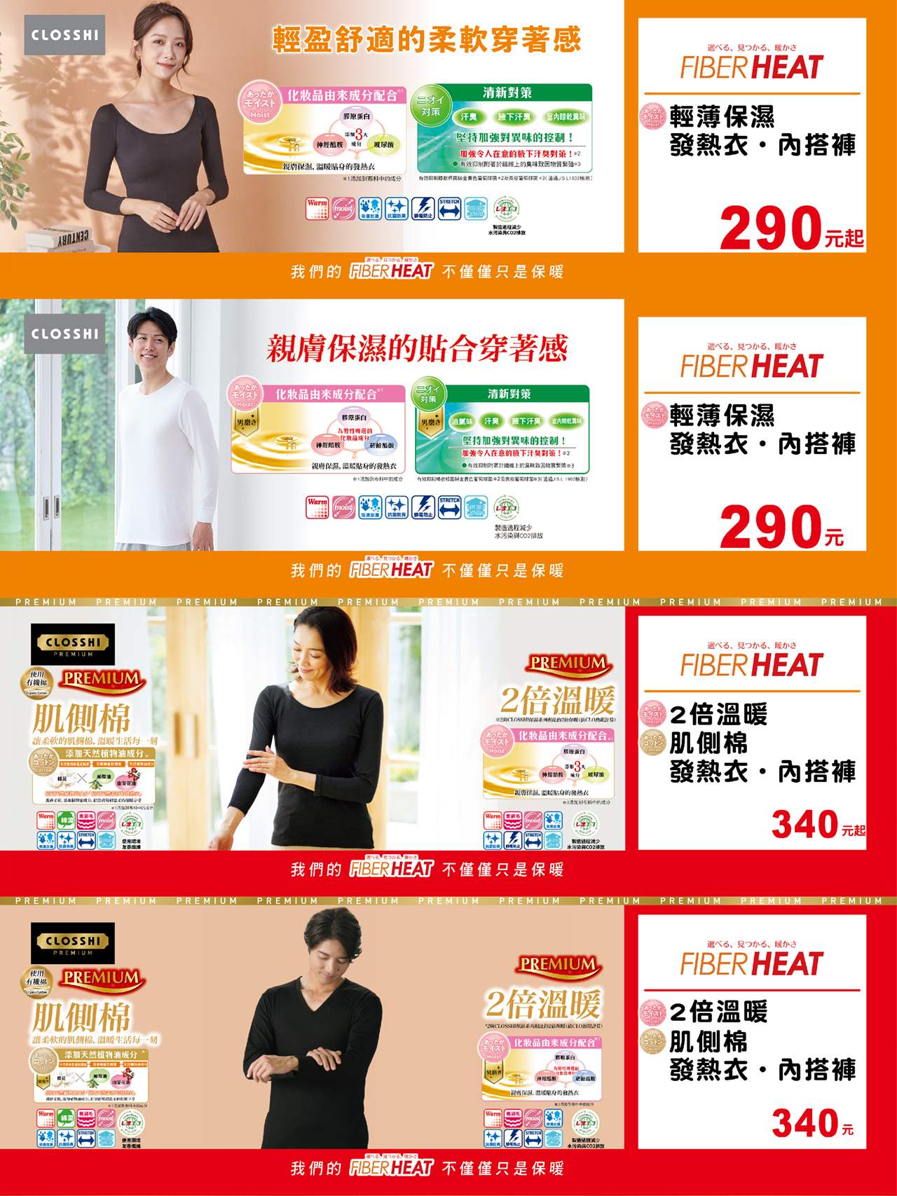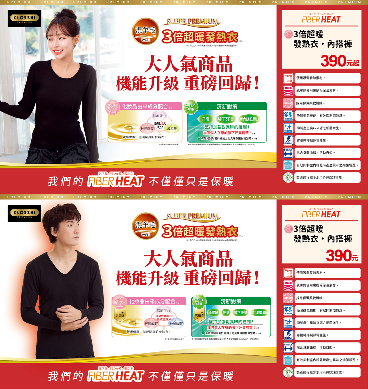 FIBER HEAT「保暖 × 保濕」雙重機能,冬季肌膚的全方位守護。水潤保濕系列發熱衣,結合高效發熱纖維與保濕科技,快速升溫、持續保暖,同時維持肌膚水潤,冬季穿著更安心。輕盈貼合版型,保暖不臃腫,適合通勤、居家、旅行多場景。兼顧舒適與科技,讓每一次穿著都成為冬日質感生活的延伸。
